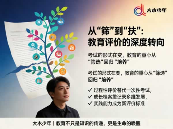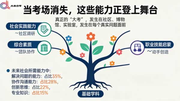 近日,一则消息在全国多地悄然传开:一些小学低年级取消了传统的期末纸笔考试。这一变化看似只是减轻了学生的短期压力,背后却暗藏着国家教育改革深层转向的信号。考试消失之后:当教育不再唯分数,孩子真正要拼的是什么? 一、减法背后,是评价体系的根本重构 取消部分年级期末考试,并非“不学了”,而是教育评价方式正在从“筛”转向“扶”。 国家“双减”政策与《深化新时代教育评价改革总体方案》明确提出:“坚决改变用分数给学生贴标签的做法”。取而代之的,是“游戏化闯关”“实践任务包”“成长档案袋”等过程性评价。这意味着: 知识掌握的标准,正从“记了多少”转向“会用多少” 一道数学题,不再只是看答案是否正确,而是观察孩子如何理解问题、尝试哪些方法、如何表达思路。这种转变,与“大木少年”提倡的“在社会实践中学习”不谋而合——真实世界的问题,从来不会以标准化试题的形式出现。 ![]() 二、考场缩小了,真正的“大考”才刚刚开始 当教室里的考试淡出,三种更重要的能力考核正登上舞台: 1. 社会实践能力——在真实场景中解决问题的能力 走访社区发现公共需求,设计解决方案;在博物馆中完成主题探究任务。这些“无标准答案”的实践,考核的是观察、调研、协作与创新这一整套能力组合。正如某试点学校让学生“规划一次家庭春节出行”,其中涵盖预算计算、路线设计、文化了解等多维能力。 2. 综合素质养成——那些考试考不出的品质 北京市某小学用“冬奥志愿者模拟挑战”替代考试:团队合作设计宣传方案、用中英文介绍场馆、解决突发状况。过程中体现的沟通力、责任感、应变力,正是未来社会最看重的“隐性能力”。 3. 职业技能启蒙——与真实世界的早期握手 浙江一些学校开设“校园职业体验周”,孩子轮流担任图书管理员、食堂监督员、活动策划者。这些体验看似简单,却在潜移默化中培养职业认知、劳动观念与基础技能,回应了国家关于加强劳动教育与职业启蒙的政策导向。