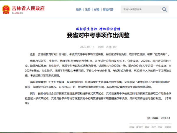 2026年3月18日,吉林省教育厅的一则公告再次将“中考取消生物地理计分”的话题推上热搜。自2025年以来,江苏宿迁、安徽黄山、江西吉安、陕西咸阳等地纷纷发文,明确从2027年起,生物学、地理两科不再计入中考总分,转而以等级形式呈现或调整为考查科目。在一片“减负”的欢呼声中,更值得追问的是:当两门学科从分数的“紧箍咒”中松绑,教育究竟要在哪里“加分”? ![]() 这并非简单的科目删减,而是一场从“分分计较”到“人的完整成长”的深刻转向。它以“双减”为底色,以评价改革为笔锋,正在勾勒一幅基础教育高质量发展的新图景。 一、 破解“内卷”藩篱:从“全科开考”到“腾挪空间” “八年级就开始很紧张,九年级更紧张,连续两年都太紧张了,不利于学生的长远发展。”江西吉安一位地理教师的感慨,道出了此番改革的直接动因。 过去,“全科开考、分分必争”的考试模式,让初中阶段几乎每年都处于“备考进行时”。生物、地理两科通常在八年级下学期即参加中考,学生不得不在主科未结业的情况下提前进入“准毕业班”状态。吉林省教育厅明确,此举旨在减轻学生负担、破解“教育内卷”。安徽黄山将两科调整为等级呈现,设置了97%的合格门槛;江苏宿迁将其改为“合格性考查”,目的均是让师生从无谓的分数拉锯中抽身。 ![]() 正如北京师范大学薛二勇教授所言,改革使孩子们在初中阶段“相对更宽松、更从容一些”,也让学校把主要精力用到德智体美劳全面发展上来。这是对教育节奏的修复——把时间还给孩子,把空间还给成长。 二、 回归“育人”本质:从“考什么学什么”到“学什么有用” 减分并非“不学”,更非“不考”。各地在方案中均明确,生物、地理仍作为毕业及升学的重要参考,或设等级门槛,或实行机考。那么,改革的深层逻辑究竟是什么? 中国教育科学研究院研究员储朝晖指出,中考的主要功能应回归对义务教育阶段学业成绩的检验,而非过度的筛选与选拔。当生物、地理从计分科目中剥离,它们便从“应试链”的末端解放出来,回归学科本身的育人价值。 生物学本应带领学生走进田间地头观察生态系统,地理学本应引导他们仰望星空探索山河脉络。但一旦与分数挂钩,探索欲往往被标准答案取代。将两科调整为考查科目,实则是对学科本质的“松绑”:让学生不是为了背诵等高线而学地理,而是为了读懂脚下的土地;不是为了死记细胞结构而学生物,而是为了敬畏生命的力量。这恰恰契合了新课标所倡导的核心素养导向——从“解题”走向“解决问题”。 三、 填补“留白”地带:研学实践与“五育并举”的时代呼应 当生物地理不再计分,腾出的时间和精力流向何处?答案或许藏在日益蓬勃的研学实践教育中。 福建理工大学宋雪霞教授在《中国教育报》撰文指出,研学实践连接学校与社会、理论与实践,能让学生在真实情境中实现“从‘做题’到‘做事’的转变”。过去,生物地理知识囿于纸面,学生通过刷题掌握植物分类、气候类型;如今,这些知识完全可以走进研学基地,在自然博物馆、湿地公园、农业示范园中“活”起来。 “物理课本上的力学原理变成了桥梁建筑的实地测绘,生物课本上的物种知识变成了田间地头的生态调研”。当中考的功利性目标弱化,知识便回归了其本真的状态——可触摸、可探究、可创造。德宏州在推进研学旅行时明确提出,要“促进书本知识和生活经验的深度融合”,利用自然类、地理类基地开展实践活动。这正是对中考改革所释放“留白”的最好填充。 ![]() 换言之,生物地理不计入总分,不是降低这两科的学科地位,而是改变其评价方式——从“纸笔测试”转向“实践考察”,从“分数竞争”转向“素养达成”。 四、 顺应“双减”大势:从“单维评价”走向“立体画像” 此次中考科目调整,是国家“双减”政策的纵深推进。2026年作为“十五五”开局之年,教育部明确提出要“全面构建公平优质的基础教育体系”,实施基础教育重大工程。“公平优质”四字,意味着教育不能再以牺牲学生身心健康为代价换取分数,而要提供更包容、更多元的成长通道。 将生物、地理调整为等级考查,正是打破“唯分数论”的关键一招。它传递出一个清晰信号:中考正从“选拔性测试”向“学业水平检测”回归,高中录取也将从“总分比拼”向“综合素质评价”过渡。正如薛二勇教授所言,这是“弱化中考人才选拔通道的体现,也是适应教育资源供给结构性变化的大势所趋”。 等级呈现的方式,让97%的学生都能顺利通过门槛,避免了因一分之差而错失普高机会的“残酷竞争”。这既保护了学生的自信心,也为普通高中多样化发展留出了空间。 总而言之:让教育回归“人的成全” 多地宣布生物地理不再计入中考总分,看似是减法,实则是加法。减的是过重的学业负担和无效的内耗,加的是实践育人的空间和全面发展的可能。 储朝晖建议,更理想的方式或许是实行“选考”,让学生在兴趣中成长。这提醒我们:改革仍在路上。但无论形式如何变化,其内核始终清晰——教育不是为了甄别谁是“失败者”,而是帮助每个人成为“更好的自己”。 当中考的指挥棒不再仅仅指向分数,而是指向好奇心、求知欲和实践力,我们才能真正迎来一个“让知识在泥土中扎根,让信仰在行走中淬炼”的教育新时代。这既