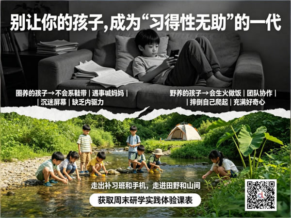 高盛的一份报告预测,全球将有3亿个工作岗位被AI取代。麦肯锡说,到2030年,中国至少有1.18亿人需要重新学习技能才能不被淘汰。 这不是危言耸听。 看看身边:翻译软件越来越准,初级程序员被Copilot替代,插画师开始和Midjourney抢饭碗,甚至编剧、律师、医生……这些曾经的高薪职业,都在被AI蚕食。 那么问题来了:我们的孩子,凭什么不被淘汰? 答案或许会让你意外——不是更早地学编程,不是刷更多的题,而是走进田野和山间。 AI无法替代的,恰恰是那些“不插电”的能力 让我们冷静分析一下:AI最擅长的是什么? 是重复性、规则明确、基于已有数据的任务。它能比任何人更快地检索信息、计算数据、生成标准化内容。 但AI永远无法替代的,是这四种能力: 1. 创造力和想象力 AI可以模仿梵高的风格画画,但它没有经历过梵高的苦难与狂热。真正的创造,源于真实的情感体验。 当一个孩子在田野里奔跑、在山顶看日出、在溪水里摸鱼,他的大脑会建立起独一无二的神经连接——这才是创造力的源头。 2. 同理心和情绪智力 AI可以识别你的表情是“悲伤”,但它永远不会真正理解失去的痛苦。只有人和人之间的真实互动,才能培养出共情能力。 在团队研学中,孩子需要学会倾听、理解、合作、安慰——这些软技能,AI做不到,却是未来社会的“硬通货”。 3. 解决非结构化问题的能力 考试题有标准答案,但真实世界没有。当孩子在野外迷路、在露营时帐篷坏了、在徒步中队友受伤了……这些突发状况,没有教科书可以翻。 这种在混乱中寻找解决方案的能力,恰恰是研学实践教育最擅长的。 4. 抗挫力和坚毅品格 AI不会沮丧,也不会坚持。而一个在泥泞中摔倒又爬起、在烈日下坚持走完10公里的孩子,他内心锻造出的韧性,是任何算法都无法复制的。 为什么答案在“田野和山间”? 因为自然教育和研学实践教育,恰好是培养这四种能力的最佳场景。 ![]() 在田野里:孩子看到种子破土而出,理解了生命的力量;亲手收割稻谷,懂得了“粒粒皆辛苦”不是一句诗,而是身体的记忆。这种沉浸式体验,远比背诵标准答案更能激发内驱力。 在山林间:孩子需要辨别方向、预估体力、团队协作。一次成功的登顶,带来的自信心和成就感,是手机游戏里一百次“胜利”都给不了的。 在营地中:没有外卖、没有Wi-Fi、没有叫醒服务。孩子需要自己做饭、自己整理、自己解决问题。生活自理能力和责任感,在这里自然生长。 ![]() 而这些,正是AI无法剥夺的人类核心优势。 被“圈养”的孩子,正在失去未来 与之形成鲜明对比的,是那些被补习班和手机“圈养”的孩子。 他们擅长刷题,却不会系鞋带;能背出几十个公式,却在真实问题面前手足无措;在网上能说会道,线下却不敢和陌生人说话。 心理学上有一个概念叫“习得性无助”。 当孩子长期被安排、被保护、被电子屏幕包裹,他们会逐渐丧失主动探索的欲望和能力。遇到困难的第一反应,不是“我试试”,而是“妈妈怎么办”或者“问一下豆包”。 这样的孩子,在未来AI主导的高效社会里,恰恰是最容易被替代的——因为没有内驱力、没有创造力、没有抗挫力的人,和机器没有区别。 ![]() 未来10年,真正“抗淘汰”的孩子长什么样? 他可能奥数不是第一名,但他对世界充满好奇,会蹲下来观察一只蚂蚁搬家。 他可能英语发音不标准,但他能用肢体语言和笑容,和不同国家的人交朋友。 他可能背不全唐诗三百首,但他在面对落日时,会发自内心地感叹“好美啊”——而这份对美的感知力,正是创造力的起点。 他不需要和AI比拼记忆和计算,因为那些AI都能做。他只需要做好一件事:成为一个完整的人。 我们的期盼:把童年还给真实的世界 作家梭罗在《瓦尔登湖》里写道:“我到林中去,因为我希望谨慎地生活,只面对生活的基本事实。” 我们的孩子,也需要这样一片“瓦尔登湖”。 它不需要很远,可以是城郊的一片田野、一座小山、一个农场。关键是,请放下手机,带他走出去。 让他去淋一场雨,去爬一棵树,去追一只蝴蝶,去生一堆火,去和一个陌生的小朋友搭话。 这些看起来“无用”的事,恰恰是未来最有用的东西。 因为AI永远无法替代的,是一个被大自然亲吻过、被真实体验滋养过、在挑战中淬炼过的鲜活灵魂。 而这个灵魂,才能在未来任何风浪里,站得稳、走得远。 |