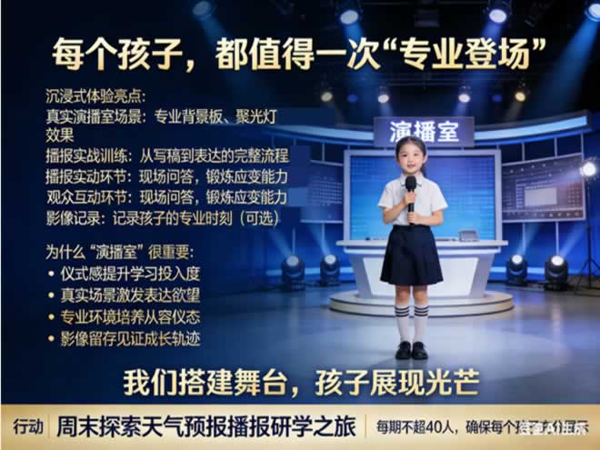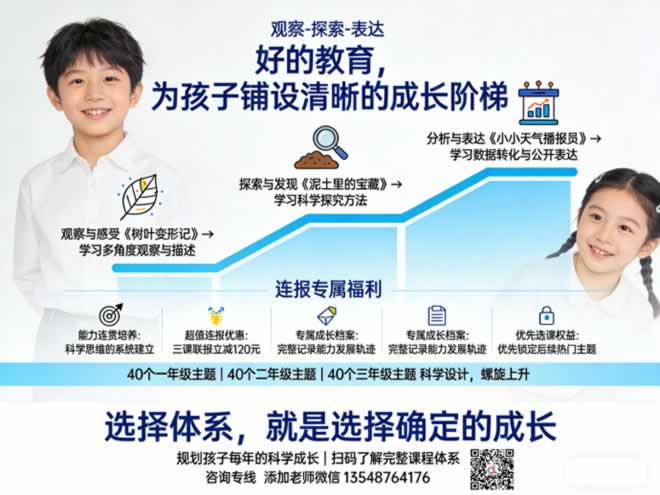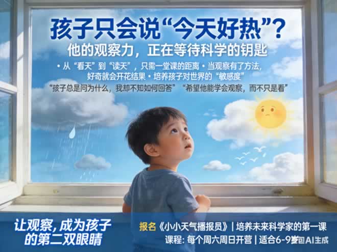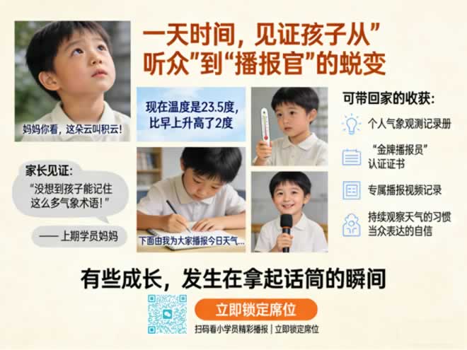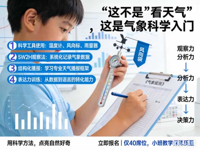 这不仅是知识,更是一种“元能力”: 1.观察力:从“看天”到“读云”,学会捕捉细节变化 2.科学思维:从现象到数据,建立因果逻辑链条 3.表达力:从模糊描述到精准播报,锻炼结构化输出 4.生活力:学会根据天气自主决策,成为生活的小主人 当孩子开始关注气温变化、风向转换,他就开始了对这个世界最基础的科学研究。 一日课程:从观察员到播报员的完美蜕变 上午 9:00 | 气象局“入职仪式” ●角色扮演:戴上“实习气象员”工作证 ●初识工具:认识温度计、风向标、雨量器 ●激发使命:为什么要关注天气? ![]() 上午 9:30 | 户外气象观测站 这是课程的核心环节,孩子将亲手操作、真实记录: ●温度测量:学习读取温度计,比较阳光下与树荫下的温差 ●风向判断:制作简易风向袋,理解“风从哪里来” ●云图识别:对照云图卡片,判断多云、少云、阴天 ●科学记录:使用5W2H记录法,完成《我的气象观测表》 上午 10:45 | 播报稿创作工坊 ●模板学习:掌握“问候-数据-建议-结束”的播报结构 ●个性化创作:将观测数据转化为生动易懂的播报词 ●道具制作:设计天气符号卡片、绘制简易地图 下午 13:15 | 小小天气播报员大赛 ●真实演播室:布置专业背景,配备“话筒” ●轮流播报:每人1分钟完整天气播报展示 ●互动问答:台下“市民”提问,播报员现场解答 ●导师点评:从内容、表达、仪态多维度反馈 下午 14:30 | 气象智慧与授勋 ●古人的智慧:学习“朝霞不出门”等天气谚语 ●现代的应用:了解天气预报如何服务我们的生活 ●荣誉时刻:颁发“金牌小播报员”证书 ●家庭任务:连续3天为家人播报天气 这堂课将带给孩子的四个成长 ![]() 一、 把“常识”变成“科学” 孩子不再只说“今天好热”,而是会说: “现在是上午10点,气温26度,东南风2级,属于凉爽的秋天天气,建议穿薄外套。” 二、 从“被动听”到“主动讲” 我们提供表达模板,但鼓励个性化创作。每个孩子都将完成: ✅ 一份完整的观测记录 ✅ 一段逻辑清晰的播报稿 ✅ 一次自信大方的公开演讲 三、 让“学科知识”真正“活”起来 数学:温度读数和比较 语文:精准描述和口头表达 科学:天气现象的观察与分析、风向和气候的初步认知 ![]() 四、 收获一份“可以带回家的能力” 课程结束后,孩子会: ●主动查看天气预报 ●根据天气自主准备衣物 ●向家人解释天气现象 ● 持续观察并记录天气变化 课程的专业保障 体系化设计 这是周末研学营120个主题中的第3课,形成“自然观察-地下探索-气象科学”的能力进阶链条。 安全与专业 ●所有观测工具均为儿童安全设计 ●户外活动在安全可控范围内进行 ●师生比1:8,确保每个孩子得到充分关注 ●配备急救包及应急预案 成果可量化 每个孩子将带走: 1.《我的气象观测表》完整记录 2.个人播报视频(经家长同意) 3.“金牌小播报员”证书 4.导师的个性化能力发展建议 家长见证 “孩子上完课第二天早上,居然看着窗外说‘妈妈,今天云层很厚,可能会下雨,我们带伞吧’。那一刻我知道,这堂课值了。” ——上期学员家长 李女士 “以前让他上台说话就躲,这次居然主动要求第一个播报。看到他站在‘演播室’里自信的样子,我比他还激动。” ——上期学员家长 王先生 ![]() 报名信息 课程时间:每周周六和周日9:00-15:00 招募对象:小学一至三年级学生(独立参加) 活动地点:自然教育营地 课程费用:398元/人(含所有材料、保险、午餐、证书) 特别福利: 1.连报3个主题(树叶+泥土+天气)立减80元 2.赠送气象观测工具包(简易温度计+风向标) 3.前10名报名赠送专业《天气符号》手册 常见问题 Q:孩子比较内向,能完成播报吗? A:我们的课程设计有循序渐进的表达训练。从小组内练习,到小范围展示,最后才是正式播报。导师会给予充分鼓励和支持,大多数孩子都能突破自我。 Q:如果天气恶劣怎么办? A:我们拥有室内气象科普馆作为备用场地。无论晴天雨天,课程都能完整进行。极端天气情况下会提前通知改期。 Q:需要提前准备什么? A:只需准备一颗好奇的心。我们会提供所有专业工具和材料。建议穿着适合户外活动的衣物和鞋子。 写给家长的话 我们常常教孩子“仰望星空”,却忘了教他们“看懂天空”。 一片云的形状、一阵风的方向、温度计上小小的刻度……这些日常容易被忽略的细节,恰恰是培养孩子科学素养、观察能力和表达自信的最佳素材。 当您的孩子学会用科学的眼光看天气,用清晰的语言说天气,TA收获的不仅仅是一堂气象课。 TA收获的是一种认识世界的方法,一份表达自我的勇气,和一颗对自然保持好奇的心。 让您的孩子成为家里最懂天气的人 报名通道已开启 扫描下方二维码,立即锁定席位 ![]() 也可拨打 4008609959 或泽熙老师 13548764176 (验证信息:小小天气播报员) 每个周末,小小肩膀,预报天下 从观察第一片云开始 开启科学与表达的双重旅程 有些能力,从看懂一片云开始。 有些自信,在拿起话筒时诞生。 |