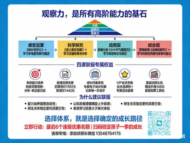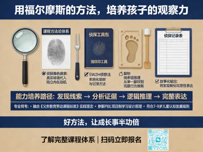 课程时间:每周周六和周日9:00-15:00 招募对象:小学一至三年级(独立参加,每期40人) 探索地点:自然探索营地(专设“侦探森林”区域) 课程投资:398元/人(含全套侦探工具包、保险、午餐、勋章及手册) 四课连报专属权益: 1.连报优惠:连报《树叶》《泥土》《天气》《脚印》四课,立减150元 2.成长档案:获得专属自然观察成长档案册 3.会员资格:升级为研学营VIP会员,优先选课权 4.家庭礼包:赠送家庭自然探索工具包(价值128元) 常见问题解答 Q:课程真的能提升孩子的观察力吗? A:观察力不是“看”,而是“看见并理解”。我们通过系统的侦探游戏,训练孩子有目的、有方法、有逻辑地观察。90%的学员家长反馈,课程后孩子对周围环境的敏感度显著提升。 Q:如果孩子推理错误怎么办? A:我们鼓励“合理的错误推理”。推理的过程比结果更重要。导师会引导孩子分析为什么推理可能出现偏差,这本身就是极佳的批判性思维训练。 Q:需要提前准备什么知识吗? A:完全不需要。我们提供所有知识和工具。孩子只需要带着好奇心和探索欲前来。建议穿着便于活动的衣裤和不怕脏的鞋子。 写给思考型家长 在这个信息爆炸的时代,筛选信息的能力比记忆信息更重要。 《动物的脚印》本质上是一堂信息素养启蒙课: 从杂乱的自然痕迹中,筛选关键线索(脚印) 从零散的线索中,构建合理假设(动物种类) 从初步假设中,寻找验证证据(行为痕迹) 这种从噪声中提取信号,从现象中洞察本质的能力,将是孩子未来面对复杂世界的核心武器。 当您的孩子学会用侦探的眼光看世界,他将不再只是生活的“旁观者”,而是主动的“探究者”和“解读者”。 让您的孩子成为自然界的“小福尔摩斯” 扫描下方二维码,立即锁定席位 ![]() 也可拨打 4008609959 或泽熙老师 13548764176 (验证信息:动物的脚印) 每个周末,带上放大镜和好奇心 破解大地密码,讲述脚印故事 培养受益终身的观察力与逻辑力 最珍贵的线索,往往就在脚下。 最深刻的成长,始于学会看见。 |