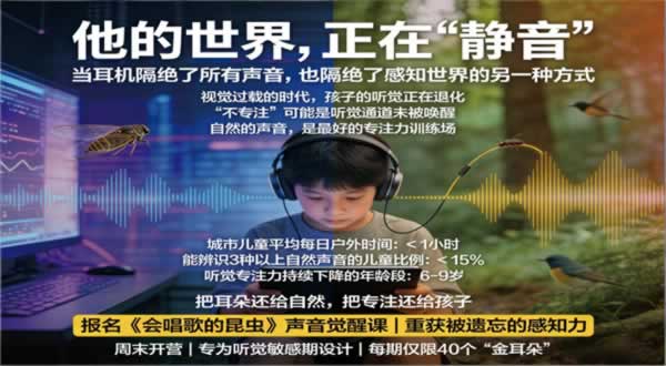 您是否发现: 孩子能盯着屏幕一小时,却听不见您叫他三声? 他能分辨游戏里的每个音效,却听不出蝉鸣和蟋蟀的区别? 这不是注意力问题,这是“听觉失焦”。 在一个视觉轰炸的时代,我们的孩子正在失去一项古老而珍贵的能力——用耳朵读懂世界的能力。 《会唱歌的昆虫》——我们的第五个周末研学主题,将带领孩子关闭一部分视觉,打开一个被忽略的、由声音构成的奇妙宇宙。