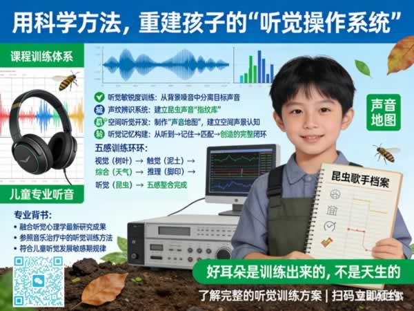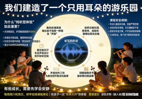 神经科学研究显示:听觉专注力,是深度学习和情绪调节的基础。 当孩子学会: 从嘈杂背景中识别目标声音 → 课堂专注力 通过音色区分不同声源 → 细节分辨力 根据声音判断距离方位 → 空间感知力 用语言描述听觉体验 → 情感表达力 他获得的不仅是自然知识,更是信息时代稀缺的“深度聆听能力”——这种能力,将直接影响他的学习效率、社交敏感度和情绪智力。 ![]() 一日课程:从“听见”到“听懂”的蜕变之旅 上午9:00 | 森林音乐会邀请函 ●情境创设:夏夜音乐会总指挥发布神秘任务 ●初识“音乐家”:盲听三种昆虫鸣叫,分享第一感受 ●感官准备:闭眼聆听1分钟,建立“声音意识” ●装备分发:颁发“金耳朵”音乐侦探徽章 上午9:40 | 声音侦探训练营 这是课程的核心能力训练环节,孩子将掌握: ●声音采样:使用专业录音设备,捕捉三种昆虫鸣叫 ●声纹辨识:学习通过音高、节奏、频率区分蟋蟀、蝈蝈、蝉 ●声音地图:在营地地图上标注不同“歌手”的位置 ●声音日记:用5W2H法记录:“什么时间在哪里听到谁在唱歌,声音像什么” 上午10:50 | 昆虫声学实验室 ●科学揭秘:亲眼观察昆虫发声部位(摩擦的翅膀、振动的鼓膜) ●破除迷思:了解昆虫不是用“嘴”唱歌 ●创意工坊:为最喜欢的昆虫“歌手”设计音乐会海报 ●歌词创作:编写一段属于昆虫的“夏夜之歌” 下午13:15 | 自然音乐会大舞台 ●舞台搭建:深蓝幕布、星光灯串,营造夏夜氛围 ●角色扮演:每个孩子扮演一种昆虫“主唱” ●创意演出:结合自编歌词与模仿动作,完成小组表演 ●交响合奏:用身体打击乐模拟“昆虫大合唱” 下午14:30 | 聆听伦理与授勋 ●深度讨论:如果世界突然静音,我们会失去什么? ●伦理建立:学习“聆听而不打扰”的自然观察准则 ●授勋仪式:颁发“自然音乐家”认证证书 ●家庭任务:今晚在家附近进行5分钟“声音冥想” ![]() 这堂课如何重塑孩子的听觉系统? 第一重:从“被动听”到“主动听” 大多数孩子生活在“背景音”中。我们训练他们: 选择性注意:在混杂声音中聚焦目标 听觉追踪:跟随声音移动,判断方位变化 声音记忆:记住并匹配不同的声音模式 第二重:从“听到”到“听懂” 声音不仅是物理震动,更是信息载体。孩子将学会: 情感解码:从鸣叫节奏判断昆虫“情绪” 意义理解:懂得不同鸣叫的求偶、警戒、交流功能 文化联结:了解昆虫鸣叫在诗歌、音乐中的意象 第三重:从“输入”到“输出” 完整的感知需要完整的表达: 输入(聆听)→ 处理(辨识)→ 创造(艺术)→ 输出(表演) 这是信息加工能力的完整闭环训练。 ![]() 课程的科学支撑体系 多学科融合设计 ●生物学:昆虫发声器官结构与功能 ●物理学:声音的产生、传播与特性 ●音乐学:节奏、音高、音色的感知 ●文学:听觉体验的创造性表达 感官整合训练 这是“五感训练序列”的收官之作: 视觉(树叶变形记)→ 触觉(泥土里的宝藏)→ 综合(天气播报)→ 推理(动物脚印)→听觉(昆虫唱歌) 完成五次课程的孩子,将建立完整的感官认知系统。 安全与专业保障 ●所有观察均在安全距离进行,不捕捉、不伤害昆虫 ●使用儿童专业监听耳机,保护听力健康 ●1:8师生配比,专业导师带领 ●完整防蚊虫及医疗保障方案 成果可视化系统 每位小学员将收获: 1.个人《声音地图》与《昆虫歌手档案》 2.小组音乐会海报与创作歌词 3.“自然音乐家”认证证书 4.专业录制的自然声音采样包 5.听觉专注力发展评估报告 家长见证:听到的改变 “上完体验课回家路上,孩子突然说:‘妈妈你听,这是空调外机的声音,那是远处汽车的声音,还有……风声。’那一瞬间我知道,他学会了‘听’这个世界。” ——《天气播报员》学员妈妈 “最让我惊讶的是,孩子现在做作业前会主动要求‘安静5分钟’。他说这是在课程中学到的‘声音准备仪式’。” ——《动物脚印》学员爸爸 报名详情 课程时间:每周周六和周日8:00-17:00 招募对象:小学一至三年级(独立参加,每期限40人) 研学地点:市自然营地或基地(专业静音环境) 课程投资:398元/人(含专业听音设备、创作材料、保险、午餐、证书) 五感序列完整礼遇: 1.连报优惠:完整参加五感序列五课程,立减200元 2.毕业认证:获得“五感小达人”毕业证书及勋章套装 3.能力图谱:专属五感能力发展雷达图 4.会员升级:VIP++会员资格,全年活动优先权 5.家庭礼包:赠送自然声景资料+家庭聆听指南 常见问题解答 Q:孩子平时对声音就很敏感,适合这个课吗? A:非常适合!敏感是天赋,需要科学引导。我们将帮助孩子将“敏感”转化为“敏锐”,学会管理听觉输入,将天赋变为优势。 Q:如果下雨/天气冷,昆虫不叫怎么办? A:我们拥有完备的室内课程方案,包括: • 昆虫鸣声音频分析工作坊 • 振动原理科学实验 • 拟声创意戏剧工作坊 无论天气如何,课程核心价值不变。 Q:需要音乐基础吗? A:完全不需要。课程重点是听觉感知和自然观察,而非音乐技能。我们鼓励每个孩子用自己的方式感受和表达。 写给懂得“听”的家长 在这个人人都在“说”的时代,我们忘了: 真正的智慧始于聆听。 ![]() 当我们教会孩子聆听虫鸣,我们其实在教他: 安静的能力——在喧嚣中保持内在平静 筛选的能力——在杂音中识别重要信息 共情的能力——通过声音理解其他生命 表达的能力——将感受转化为创造 《会唱歌的昆虫》不仅仅是