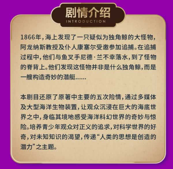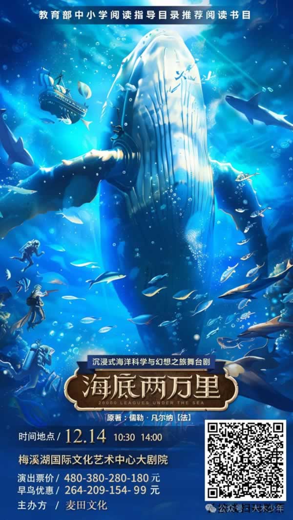 1.教育部推荐必读:这部剧改编自儒勒·凡尔纳的经典科幻巨著,是教育部中小学阅读指导必看书目,让孩子在沉浸中爱上阅读! 2.沉浸式海洋奇观:360°旋转蓝鲸震撼全场!逼真的深海场景、绚丽的灯光效果,仿佛置身神秘海底世界。 3.科学启蒙+想象力激发:探索海洋科学奥秘,感受“想象的世界远比你看到的更精彩”! 限时福利,手慢无! 早鸟55折优惠:重磅回归,认准正版!抢到就是赚到! 双场次选择:12月14日 10:30 或 14:00,请灵活安排亲子时间! 打卡长沙文艺地标:梅溪湖国际文化艺术中心大剧院,高品质观剧体验! 演出信息 剧目:海洋科幻儿童剧《海底两万里》 时间:12月14日 10:30 / 14:00(仅两场!),后续酌情安排16:30的加场 地点:梅溪湖国际文化艺术中心大剧院 标签:#长沙亲子活动 #儿童剧推荐 #海底两万里 #早鸟特惠 ![]() 你只有探索,才能知道答案! 点击链接抢票,和孩子一起潜入深海,与巨鲸共舞,解锁科学与幻想的无限可能! 长沙仅两场,错过不再有! 立即行动,早鸟55折倒计时! 剧票有限,请自行扫以下海报二维码选座购票! ![]() 转发此文,呼唤小伙伴一起潜入深海! 购买剧票过程中有任何问题请咨询:4008609959 或者 泽熙老师13548764176(微信同号) 特别说明: 以上儿童剧解释权归活动主办方麦田文化所有! |
